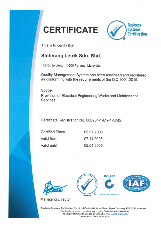 Welcome to Sinterang Letrik Sdn. Bhd. Our company has been in the electrical engineering work for over 27 years since 1991. The incorporation of the company gathers a group of electrical engineering works expertise capable to serve every requirement in the field. We are awarded Class A licensed electrical contractor by the Suruhanjaya Tenaga Malaysia and Class G7 electrical contractor from CIDB.